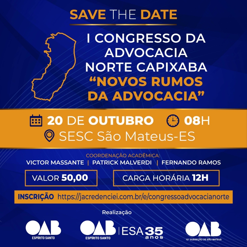 A OAB-ES, ESA e 12ª Subseção de São Mateus realizam o 1º Congresso da Advocacia Norte Capixaba: Novos Rumos da Advocacia, nesta sexta-feira (20/10), no Sesc de São Mateus.