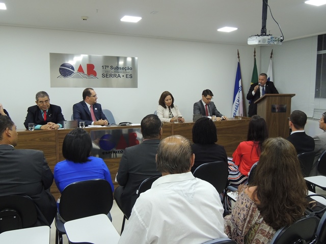 A mesa de autoridades foi composta ainda pela vice-presidente da OAB-ES, Simone Silveira, pelo secretário-geral da Subseção, Savio Pimentel Amorim e pela secretária adjunta da Subseção, Dione De Nadai.