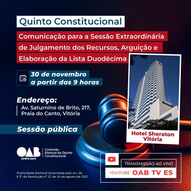 A sessão extraordinária do Conselho Seccional da OAB-ES para julgamento de recursos, arguição e escolha da lista duodécima dos candidatos à vaga do Quinto Constitucional do Tribunal de Justiça do Espírito Santo (TJES), será realizada na próxima terça-feira (30/11), a partir das 9 horas, no Sheraton Vitória Hotel, localizado na avenida Saturnino de Brito, 217, Praia do Canto, Vitória.