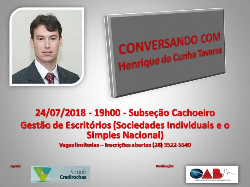 A advocacia da Subseção de Cachoeiro de Itapemirim receberá mais uma palestra do projeto Conversando Com nesta terça-feira (24). A exposição será feita pelo advogado, membro da Comissão de Estudos Tributários Henrique da Cunha Tavares, às 19h na sede da Subseção.