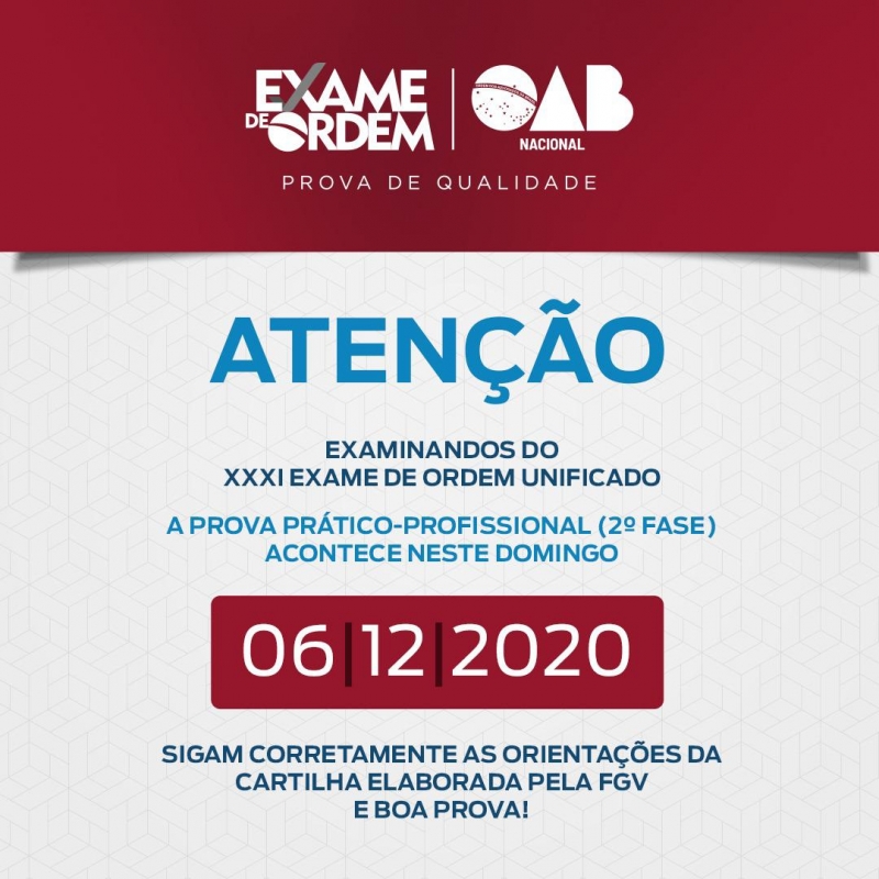 Examinandos e examinandas deverão comparecer ao local designado para a realização da prova com antecedência mínima de duas horas. A Coordenação Nacional do Exame de Ordem Unificado publicou ainda um comunicando com alterações no edital que devem ser consultados para adequada realização da avaliação.