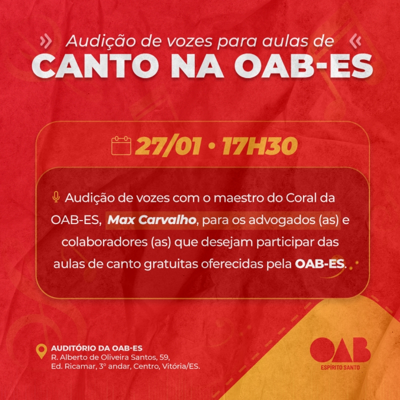 No dia 27 de janeiro, o Coral da OAB - Seccional Espírito Santo, realizará uma audição para aulas de canto e participação no Coral. A audição de vozes acontecerá na sede da OAB-ES, no Centro de Vitória, a partir das 17h30.