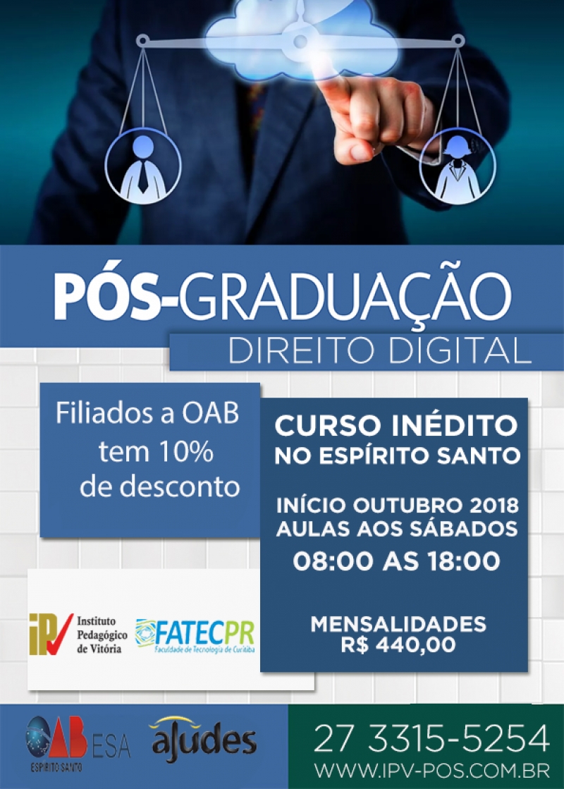 A Escola Superior de Advocacia da Ordem dos Advogados do Brasil - Seção Espírito Santo (ESA) e a Comissão de Tecnologia da Informação da OAB-ES fecharam parceria com o Instituto Pedagógico de Vitória- IPV, oferecendo descontos para a advocacia participarem do curso inédito no Espírito Santo, de pós graduação em Direito Digital, que será coordenado pelo Prof. Eduardo Pinheiro Monteiro.