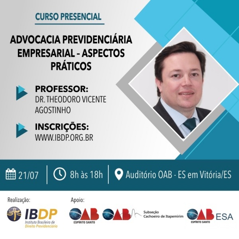O curso destina-se a advogados e demais interessados que necessitem do conhecimento jurídico no âmbito previdenciário com o objetivo de aprimoramento profissional e será ministrado pelo professor e advogado, Theodoro Vicente Agostinho, no dia 21/07, com carga horária de 8h às 18, no auditório da OAB-ES.