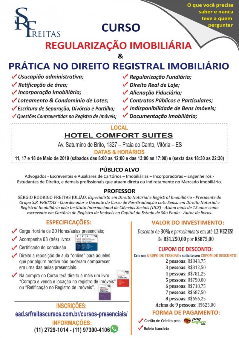 6) Bônus: O aluno inscrito no curso também terá direito a mais 01 livro publicado pelo Prof. Sérgio Freitas: I - Compra e Venda & Locação no Registro de Imóveis; ou, II - Retificação de Área e de Registro no Registro de Imóveis.