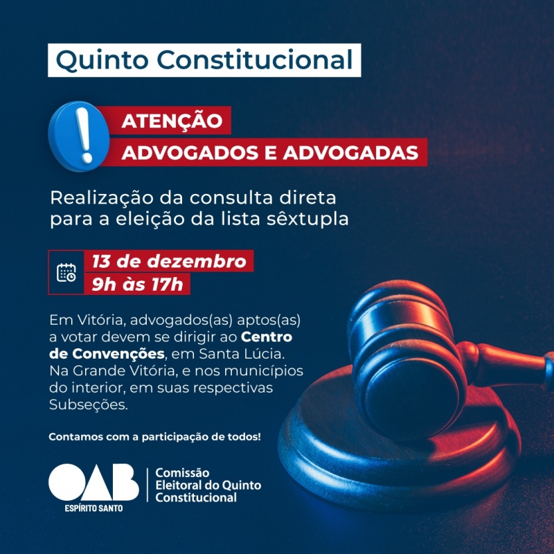 No próximo dia 13 de dezembro, segunda-feira, advogadas e advogados em todo o Estado do Espírito Santo, vão poder escolher seis nomes da classe, dentre aqueles apresentados pelo Conselho Seccional, em lista duodécima, a fim de compor a lista sêxtupla, que será enviada ao Tribunal de Justiça do Estado do Espírito Santo (TJES) para o preenchimento da vaga de Desembargador pelo Quinto Constitucional.