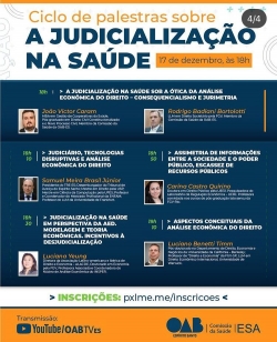 O ciclo de palestras sobre “Judicialização na Saúde” promovido pela OAB-ES por meio da Comissão da Saúde e pela ESA-ES prossegue até quinta-feira (17/12). O evento está acontecendo de forma on-line reunindo renomados profissionais do setor com apresentações de interesse de toda a sociedade civil.