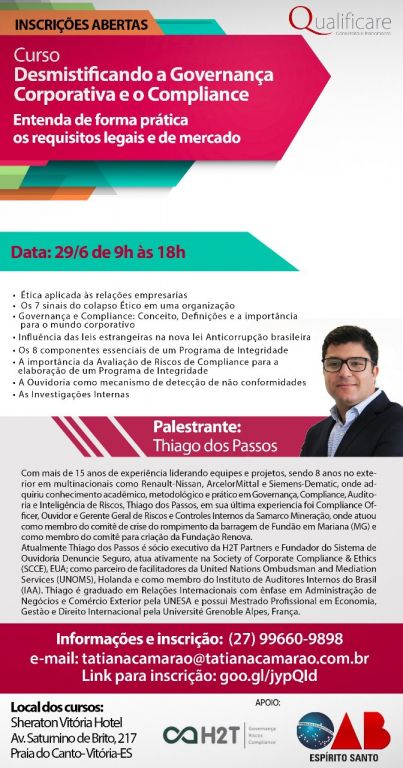 Os advogados regularmente inscritos na Ordem dos Advogados do Brasil - Seção Espírito Santo (OAB-ES), têm direito a um desconto especial para participar do curso “Desmistificando a Governança Corporativa e o Compliance”, oferecido pela Qualificare Cursos. Os primeiros quinze inscritos e a advocacia em início de carreira serão beneficiados com um valor de R$ 550,00.