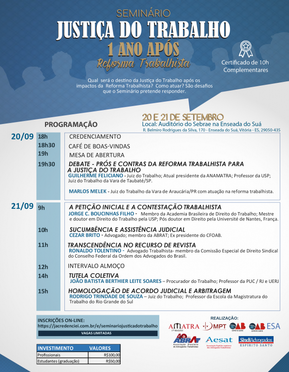 “A intenção é fazermos uma análise geral da Reforma e trabalhar também com vários pontos para colaborar com a atuação dos atores trabalhistas do dia a dia. O Seminário Lança luz em vários temas ainda polêmicos e possibilita que a comunidade trabalhista capixaba esteja junto e discutindo como pensar toda essa situação desafiadora”, completou.