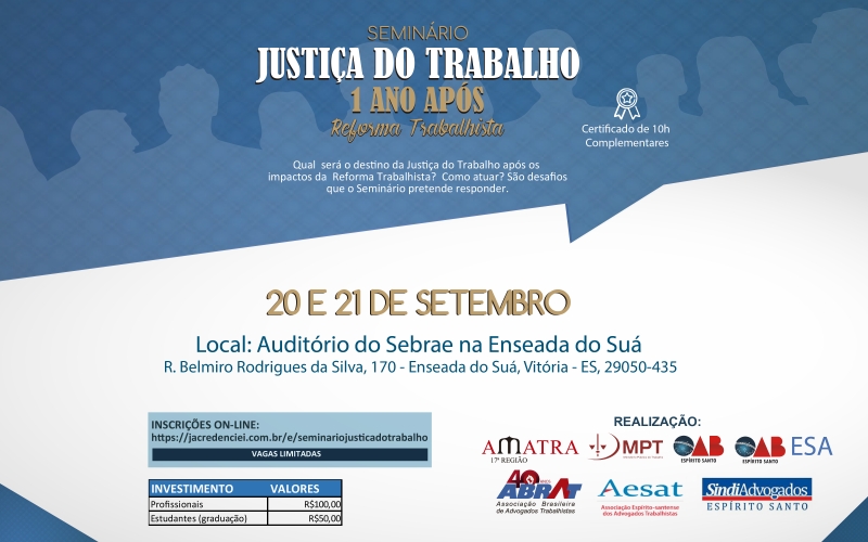 Qual será o destino da Justiça do Trabalho após os impactos da Reforma Trabalhista? Essa e outras perguntas serão objeto de debate no “Seminário Justiça do Trabalho” que será realizado nos dias 20 e 21 de setembro, no auditório do Sebrae, na Enseada do Suá. O evento foi construído em parceria da Ordem dos Advogados do Brasil – Seção Espírito Santo (OAB-ES) com a AMATRA, o MPT, a ABRAT, a AESAT e o Sindiadvogados do Espírito Santo e reunirá conceituados palestrantes que virão à Vitória especialmente para o Seminário.