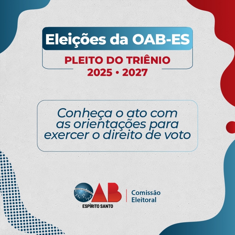 Na votação, serão escolhidos a Diretoria do Conselho Seccional, os Conselheiros Seccionais Titulares e Suplentes, os Conselheiros Federais Titulares e Suplentes, as Diretorias das demais Subseções e a Diretoria da Caixa de Assistência dos Advogados do Espírito Santo para o Triênio 2025-2027.