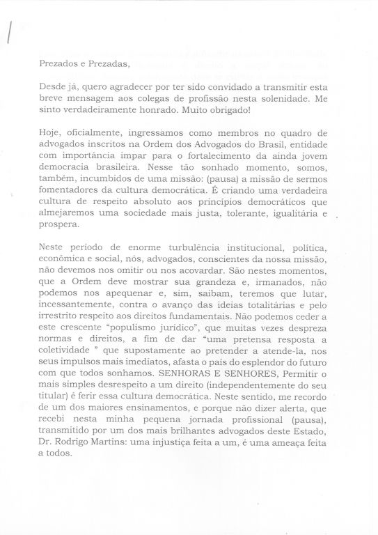 O presidente da Ordem, Homero Mafra, presidiu a cerimônia, parabenizou o orador pelo discurso e reforçou o apelo por respeito à Constituição Federal. “Vivemos um tempo de linchamentos pela opinião pública. E como foi bom ouvir hoje esse discurso. Sou essencialmente advogado. Não aceito julgamentos antecipados. O momento nesse país é terrível. As garantias constitucionais de liberdade estão sendo massacradas nos tribunais quando o STF nega a presunção da inocência, quando os homens que são chamados para guardar a Constituição a ferem, quando ministros pedem prisão de quem não foi sequer citado em inquérito. Enfim, queremos a punição dos culpados e o fim da corrupção, mas não podemos aceitar o desrespeito às normas constitucionais de garantias”, reforçou.
