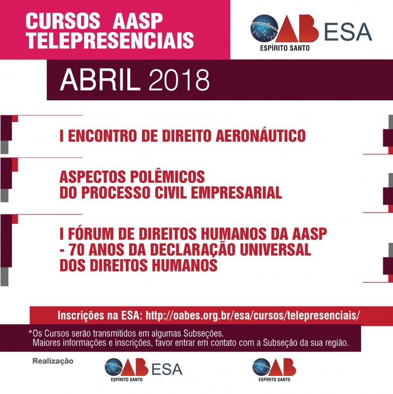 A Escola Superior de Advocacia (ESA) da Ordem dos Advogados do Brasil - Seção Espírito Santo (OAB-ES) está com inscrições abertas para os cursos Telepresenciais do mês de abril. Advogados e estagiários adimplentes com a Ordem têm descontos.