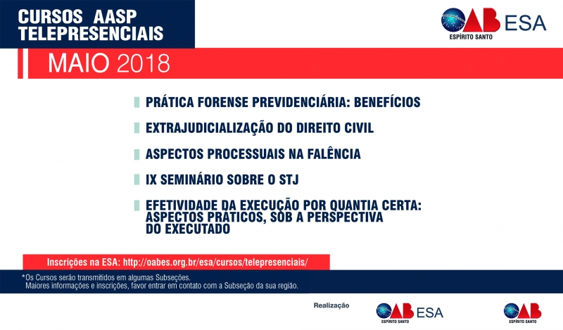 A Escola Superior de Advocacia (ESA) da Ordem dos Advogados do Brasil - Seção Espírito Santo (OAB-ES) está com inscrições abertas para os cursos Telepresenciais do mês de Maio. Advogados e estagiários adimplentes com a Ordem têm descontos.