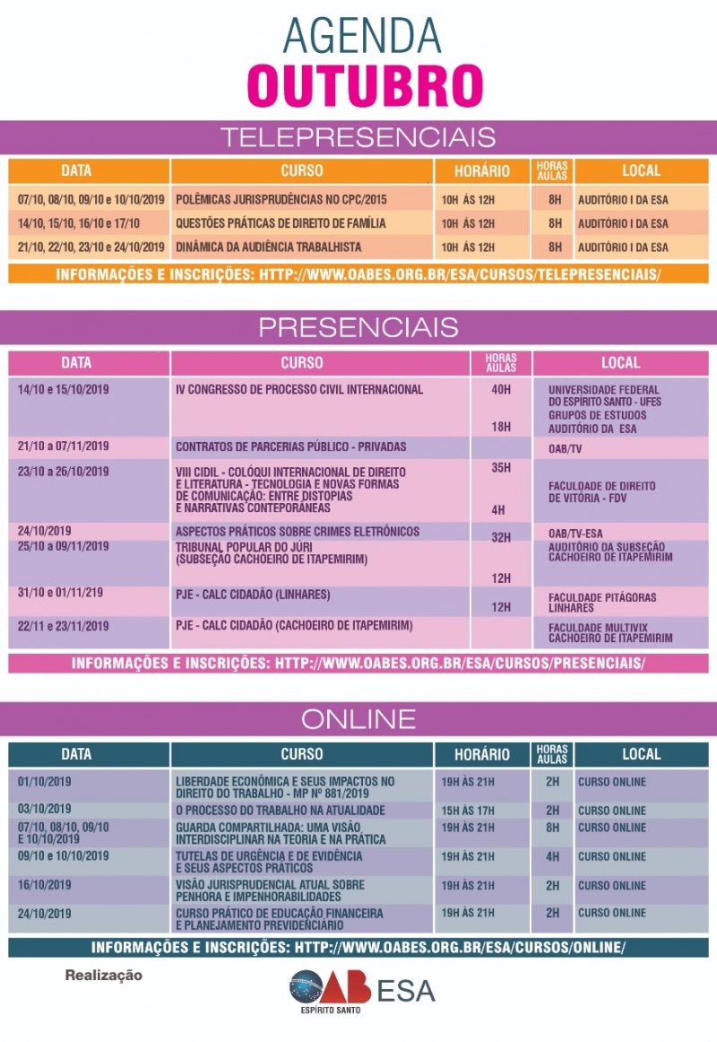 A Escola Superior de Advocacia da Ordem dos Advogados do Brasil – Seção Espírito Santo - ESA – divulgou a agenda com os cursos telepresenciais, presenciais e online para o mês de outubro.