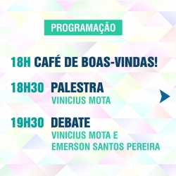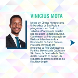 O advogado e mestre em Direitos Humanos pela Universidade de São Paulo (USP) e pós-graduado em Direito do Trabalho e Processo do Trabalho pela Faculdade Damásio de Jesus, Vinicius Mota, irá palestrar sobre o tema. Logo após, o advogado, pós-graduado em Advocacia Extrajudicial e pós-graduando em Direito Civil e Processo Civil, Emerson Santos Pereira, participará de um debate com Vinicius Mota.