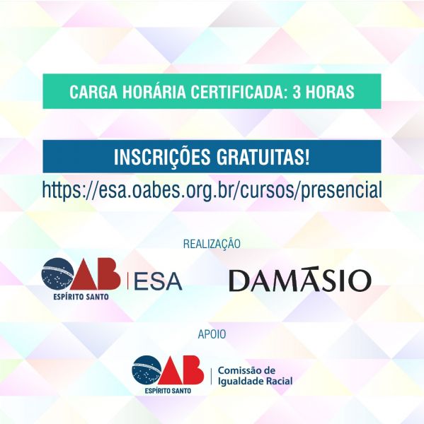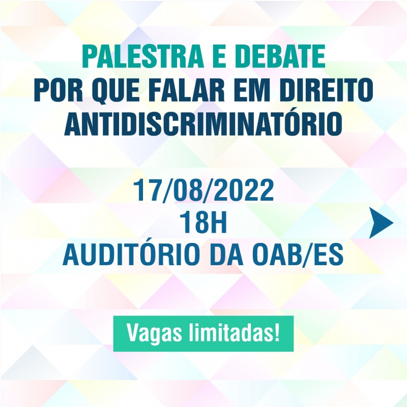 A Escola Superior da Advocacia (ESA-ES) e a Faculdade Damásio, com o apoio da Comissão de Igualdade Racial da Ordem dos Advogados, Seccional Espírito Santo (OAB-ES) realizam no dia 17 de agosto, das 18h30 às 20h, a palestra e debate “Por que falar sobre Direito antidiscriminatório”. O evento ocorrerá no auditório da OAB-ES e contará com um café de boas-vindas às 18h.
