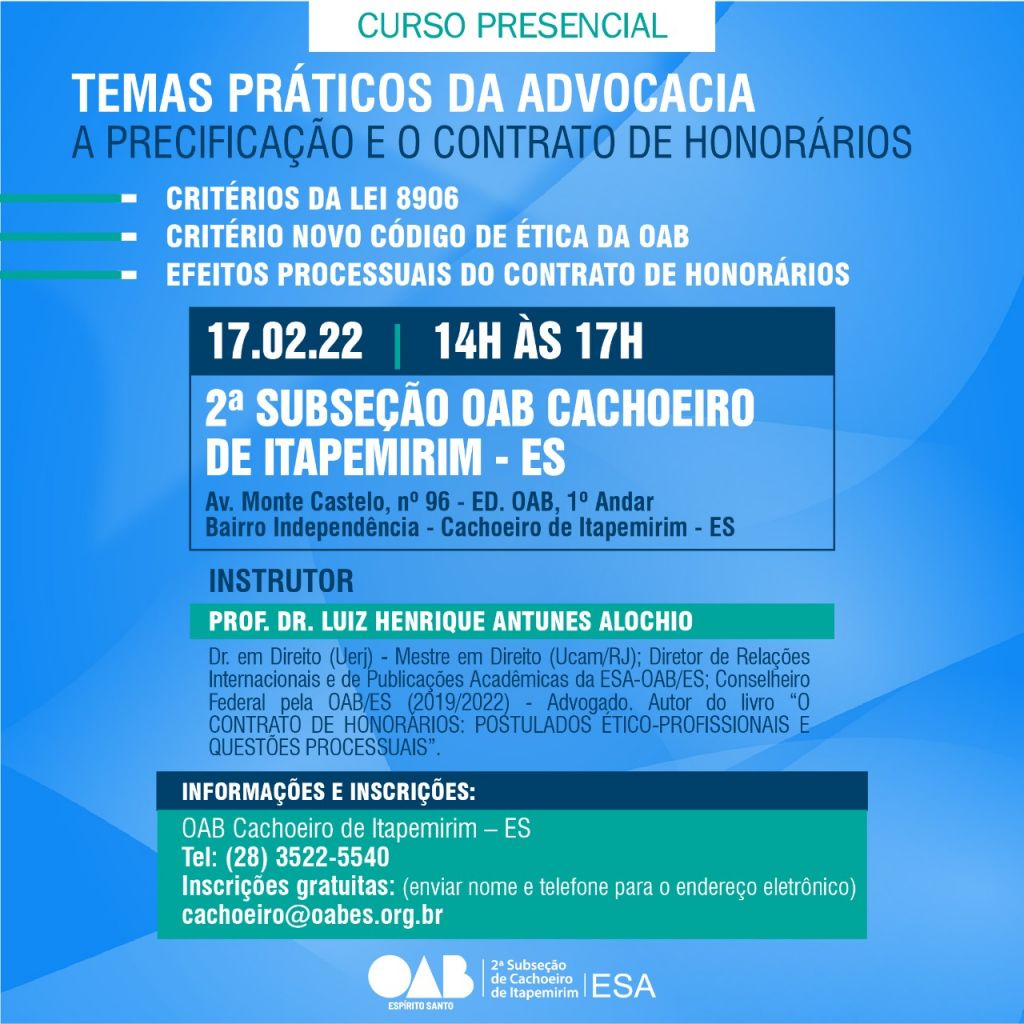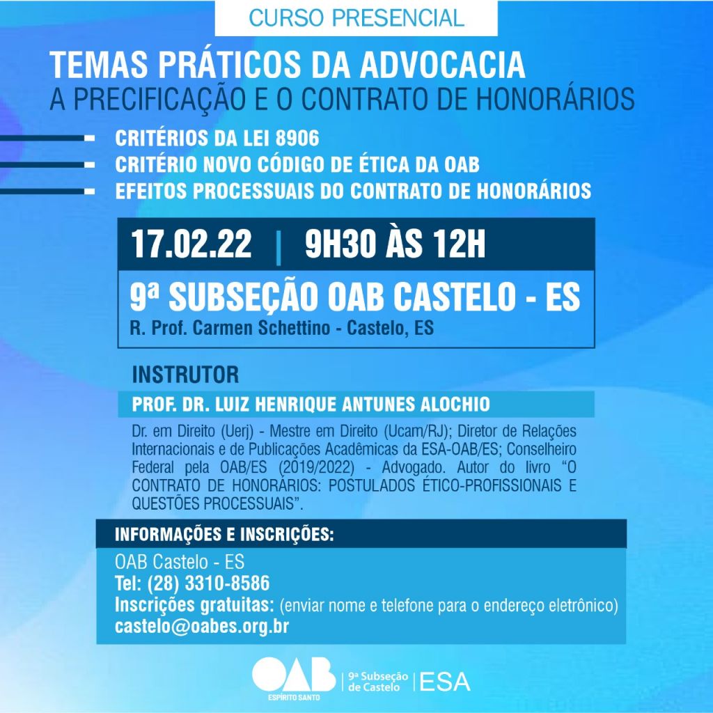 No próximo dia 17 de fevereiro, a Escola Superior de Advocacia (ESA-ES), da Ordem dos Advogados do Brasil, Seccional Espírito Santo, realizará, de forma presencial e gratuita, o curso Temas Práticos da Advocacia: a Precificação e o Contrato de Honorários. Os cursos acontecerão na 9ª Subseção de Castelo e na 2ª Subseção de Cachoeiro de Itapemirim, de 9h30 às 12 horas e de 14 às 17 horas, respectivamente. As aulas serão ministradas pelo Diretor de Relações Internacionais e de Publicações Acadêmicas da ESA-ES e professor-doutor Luiz Henrique Antunes Alochio.