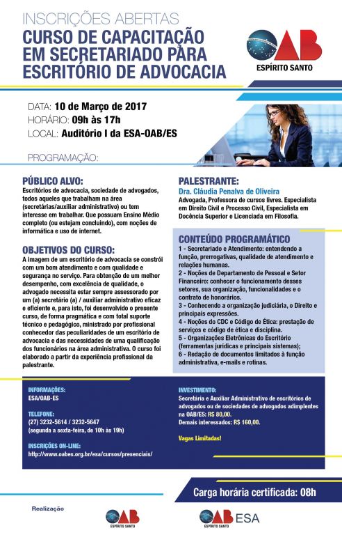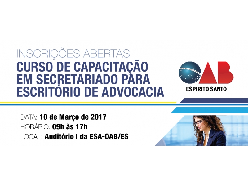 A Escola Superior da Advocacia da Ordem dos Advogados do Brasil – Seção Espírito Santo (OAB-ES), convida para o curso de Capacitação para Secretariado em Advocacia, a ser realizado em 10 de março deste ano, de 09 às 17 horas no auditório da ESA, no sede da OAB-ES, no Centro de Vitória.