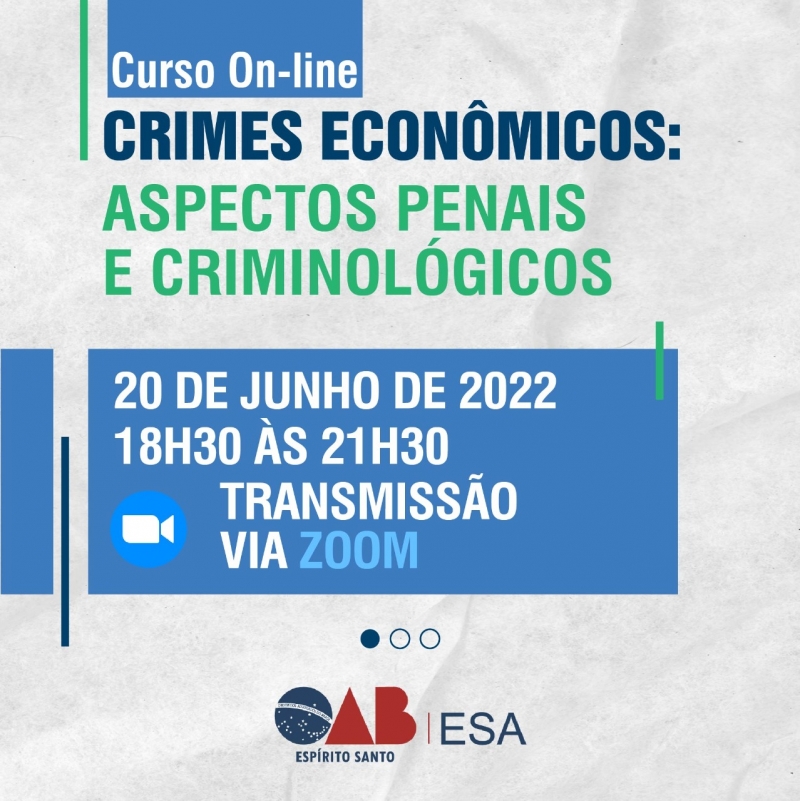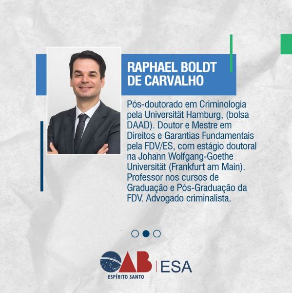 No dia 20 de junho, das 18h30 às 21h30, a Escola Superior de Advocacia da Ordem dos Advogados do Brasil, Seccional Espírito Santo (OAB-ES), realizará o curso on-line “Crimes Econômicos: Aspectos Penais e Criminológicos”. O evento será transmitido pela plataforma Zoom e terá como palestrante o advogado criminalista e pós-doutor em Criminologia pela Universität Hamburg, Raphael Boldt de Carvalho.
