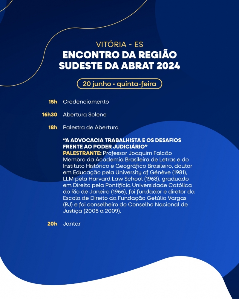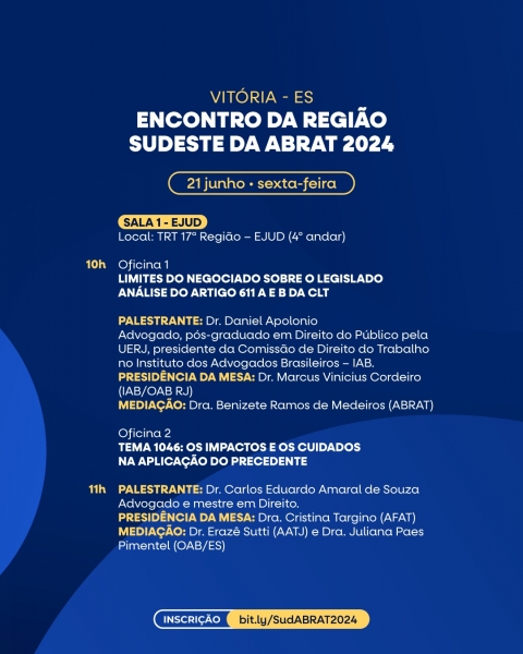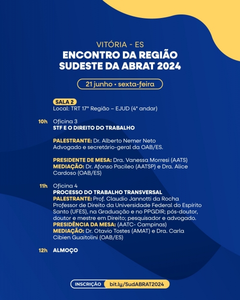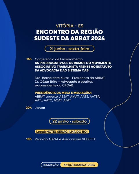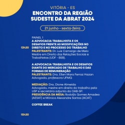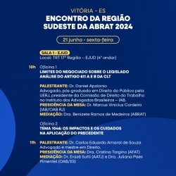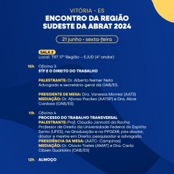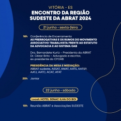 O Espírito Santo sediará o Encontro da Região Sudeste da ABRAT 2024 nos próximos dias 20, 21 e 22 de junho, no auditório da sede do TRT da 17ª Região, na Enseada do Suá, em Vitória.