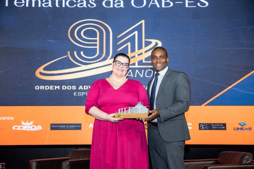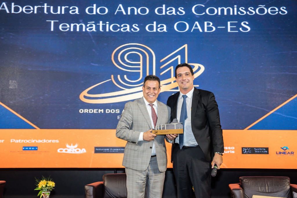 E para encerrar o evento com chave de ouro, o anfitrião, o presidente da OAB-ES, Rizk Filho, e a conselheira Gabriela Campostrini receberam no palco o advogado e professor Samer Agi.