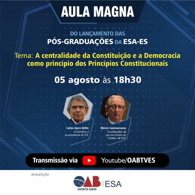 “É com muita honra e orgulho que realizaremos a aula magna do lançamento dos cursos de pós-graduação da ESA-ES com a presença ilustre do Carlos Augusto Ayres Britto. Convidamos toda a advocacia a participar do evento”, disse o diretor presidente da ESA-ES, Alexandre Zamprogno.