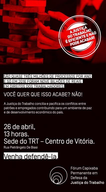O Fórum Capixaba Permanente em Defesa da Justiça do Trabalho, do qual é integrante a Ordem dos Advogados do Brasil – Seção Espírito Santo (OAB-ES), realiza no próximo dia 26/04, uma quarta-feira, um protesto contra as seguidas investidas pelo fim da Justiça do Trabalho.