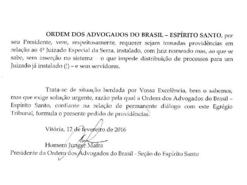 O presidente da OAB-ES, Homero Junger Mafra, requereu ao presidente do Tribunal de Justiça do Estado, desembargador Annibal de Rezende Lima, a adoção de providências em relação ao 4° Juizado Especial da Serra, que foi instalada, mas não foi inserido no sistema, impedindo que receba processos distribuídos.