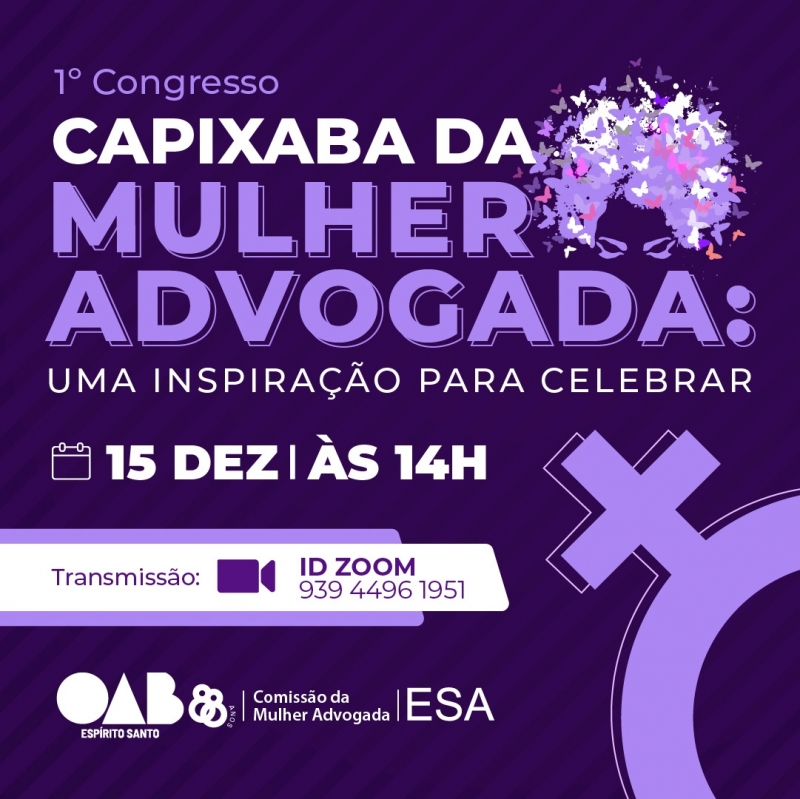 Na data de comemoração pelo Dia da Mulher Advogada, 15 de dezembro (terça-feira), a OAB-ES realizará o I Congresso Capixaba Virtual da Mulher Advogada.