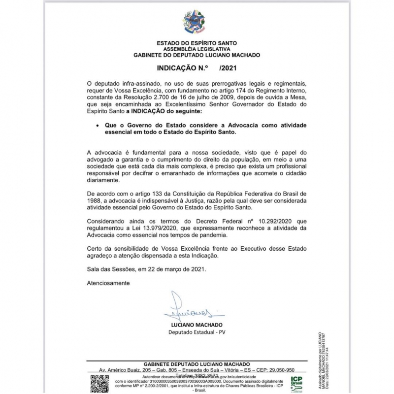 A Assembleia Legislativa do Espírito Santo (ALES) encaminhou a Indicação nº 662/2021, de autoria do deputado estadual Luciano Machado (PV), ao Governo do Estado solicitando que a advocacia seja uma atividade essencial em todo o Espírito Santo.