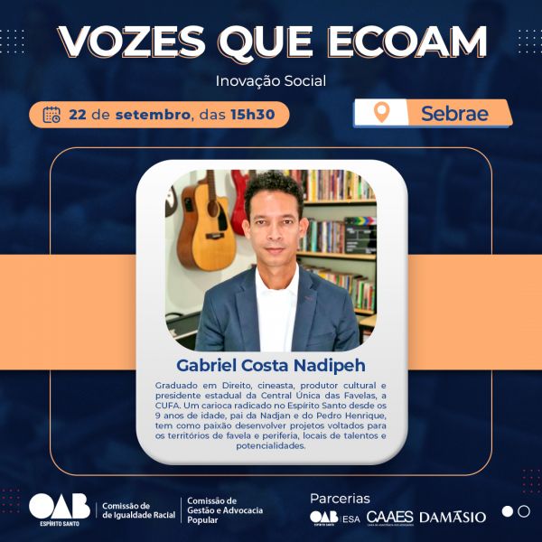 A Ordem dos Advogados do Brasil - Seccional Espírito Santo (OAB-ES), por meio da Comissão de Igualdade Racial e da Comissão de Gestão e Advocacia Popular, realiza, no dia 22 de setembro, de 15h às 19h, mais uma edição do “Vozes que Ecoam”, no Sebrae, em Vitória.