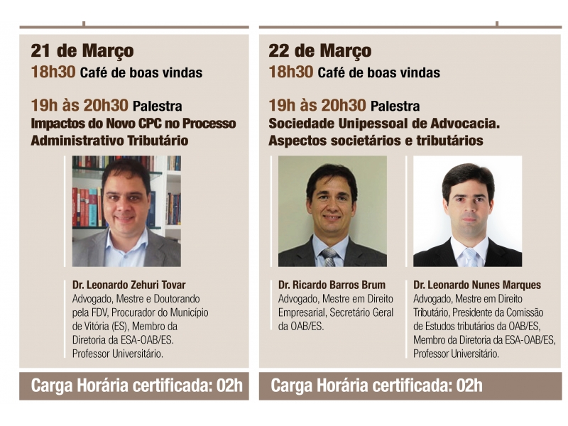 As palestras serão ministradas pelos advogados, Leonardo Zehuri Tovar, que é membro da diretoria da ESA e procurador do município de Vitória, Ricardo Brum, que é secretário-geral da OAB-ES e mestre em direito empresarial e Leonardo Nunes Marques, que também é presidente da Comissão de Estudos Tributários da Ordem e mestre em direito tributário.