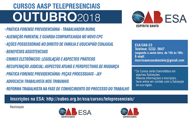 Estão abertas as inscrições para os cursos AASP telepresenciais de outubro 2018 retransmitidos pela ESA/OAB-ES. Os advogados poderão se aprofundar nos estudos sobre Prática Forense Previdenciária – Trabalhador Rural; Alienação Parental e Guarda Compartilhada no novo CPC; Ações Possessórias no Direito de Família e Usucapião Conjugal; Benefícios Assistenciais; Crimes Eletrônicos: Legislação e Aspectos Práticos; Recuperação Judicial: Aspectos Atuais e Perspectivas de Mudança; Prática Forense Previdenciária: Peças Processuais - JEF; Advocacia Trabalhista nos Tribunais e Reforma Trabalhista na Fase de Conhecimento do Processo do Trabalho.