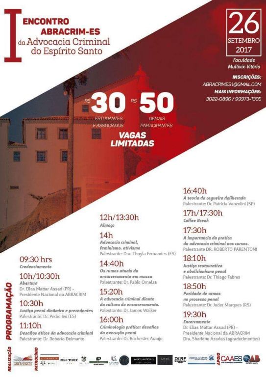 Estão abertas as inscrições para o 1º ENCONTRO DA ADVOCACIA CRIMINAL DO ESPÍRITO SANTO – ABRACRIM/ES, que acontece no dia 26 de setembro de 2017, no auditório da Faculdade MULTIVIX VITÓRIA. O evento conta com o apoio da OAB-ES.
