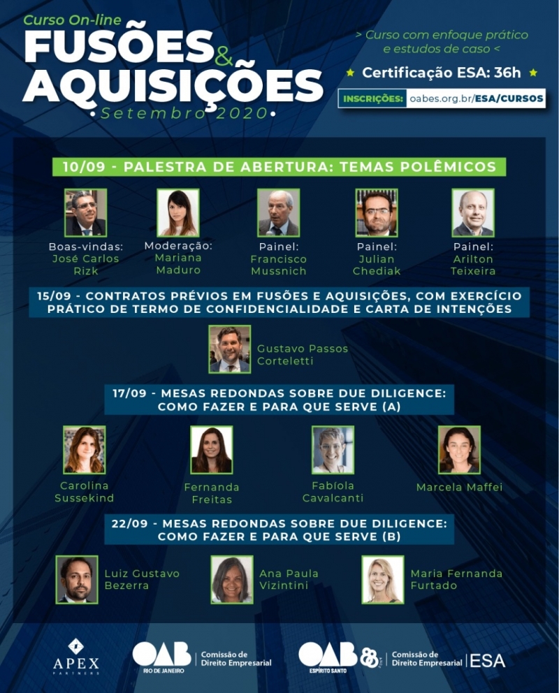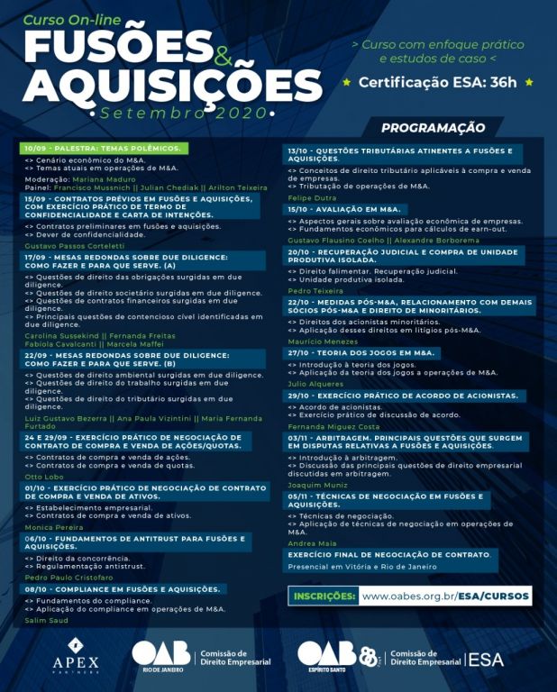 Em uma parceria inédita no Espírito Santo, as Comissões da OAB-ES e da OAB-RJ, e a ESA-ES promovem o curso on-line de Fusões & Aquisições com uma abordagem prática envolvendo a análise de casos para a advocacia.