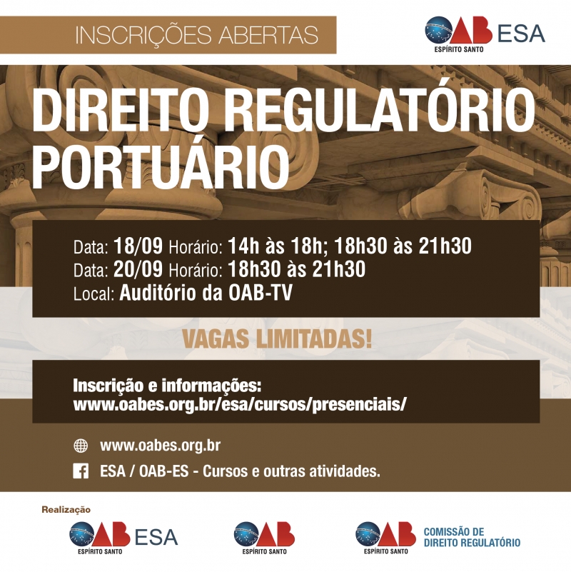 As vagas são limitadas e as Inscrições pelo site: http://www.oabes.org.br/esa/cursos/direito-regulatorio-portuario-447.html
