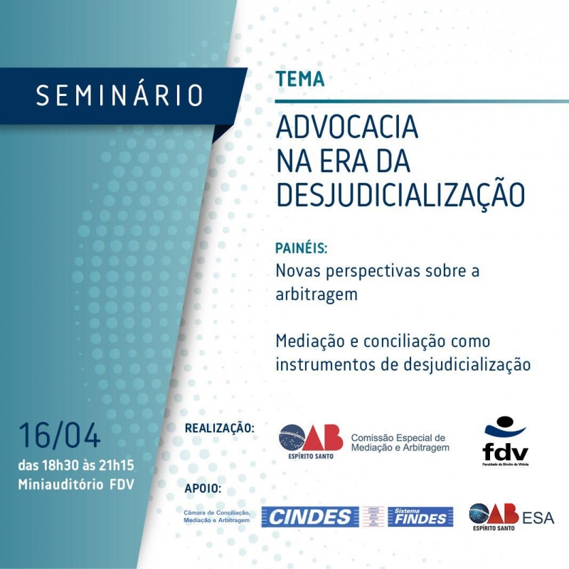 A Comissão de Mediação e Arbitragem da OAB-ES vai realizar na próxima terça-feira, dia 16, a partir das 18h30, em conjunto com a FDV, o evento sobre “Advocacia na era da desjudicialização” que acontecerá na sede da faculdade, em Vitória.
