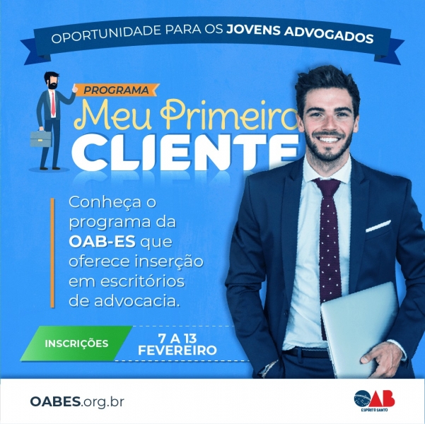 Mais de 300 jovens já se inscreveram na seleção do programa “Meu Primeiro Cliente” da OAB-ES. Inédito no Estado, o projeto incentiva jovens advogados no mercado de trabalho. Após uma prova, os selecionados atuarão em escritórios de advocacia com remuneração compatível à do mercado durante 30 dias.
