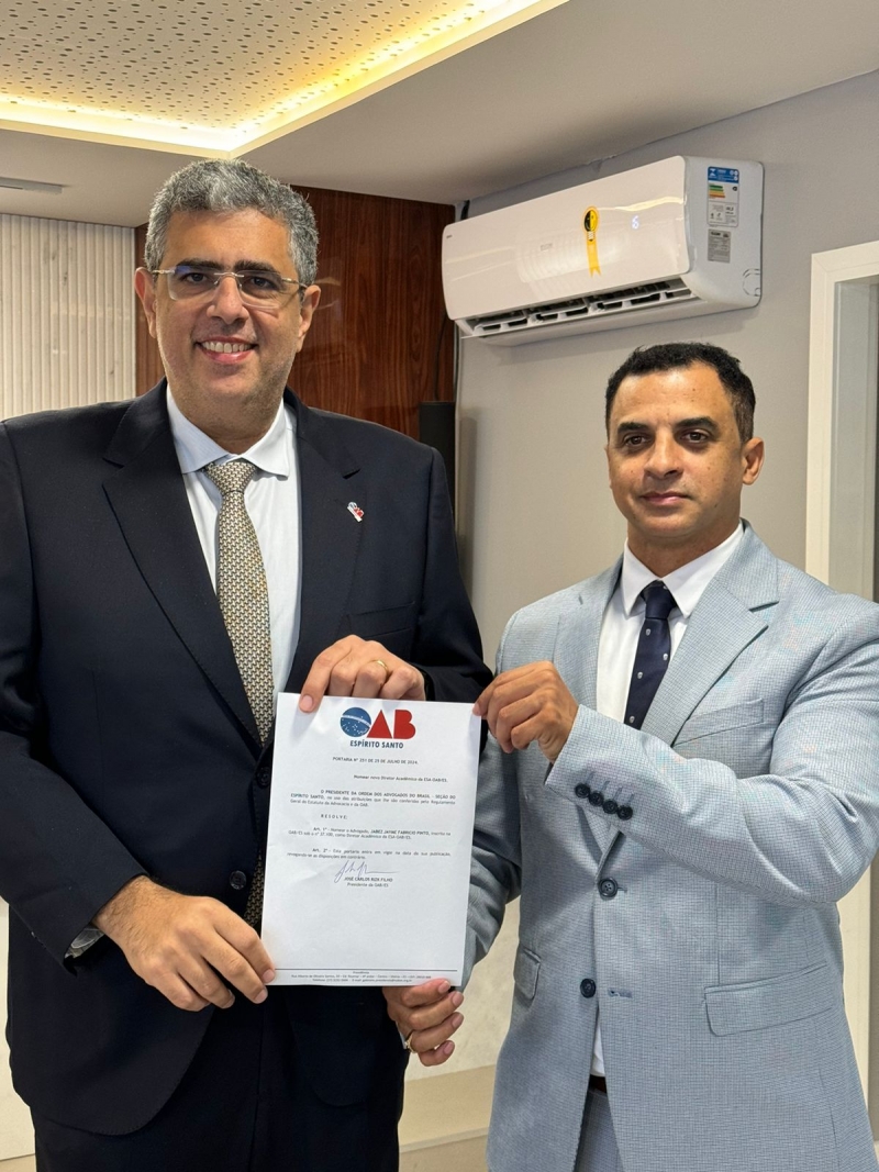 O novo diretor acadêmico foi nomeado pelo presidente da OAB-ES, José Carlos Rizk Filho, ao lado da secretária-geral adjunta, Silvia Lameira Hansen, e do tesoureiro, Anderson Félis.