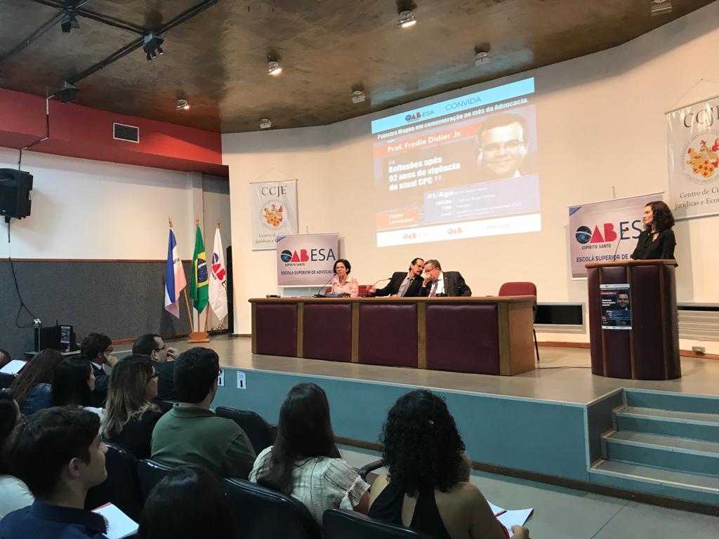 A advogada Jeesala Mayer Coutinho comentou sobre a palestra como uma oportunidade para a advocacia sanar as dúvidas em uma legislação ainda tão nova. Segundo ela, é primordial para o desempenho do exercício diário da advocacia poder ouvir Didier, um processualista renomado, e uma oportunidade que não pode ser desprezada pelos amantes do Processo Civil Brasileiro. Aproveito para agradecer a ESA/OAB-ES por proporcionar este momento tão rico de debates”.