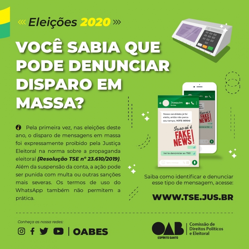 O Tribunal Superior Eleitoral (TSE), nestas eleições, proibiu expressamente o disparo de mensagens pelo aplicativo de mensagens WhatsApp, de acordo com a norma sobre a propaganda eleitoral (Resolução TSE nº 23.610/2019).