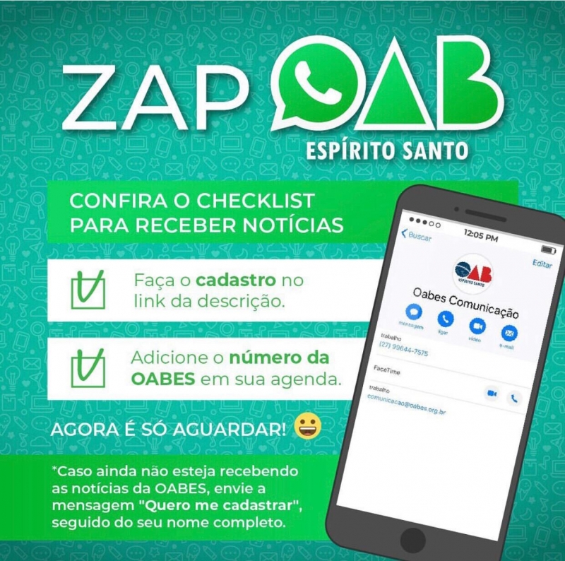 Para se cadastrar, clique aqui , preencha um pequeno cadastro e passe a receber todas as atividades da entidade. Só será preciso salvar o número da OAB, (027) 99644-7575 nos contatos do celular.