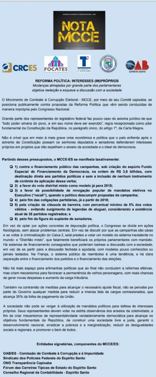 O Movimento de Combate à Corrupção Eleitoral, por meio do comitê capixaba (MCCE-ES), do qual faz parte a Ordem dos Advogados do Brasil – Seção Espírito Santo (OAB-ES), se manifestou nesta terça-feira (22), de forma contrária à proposta de Reforma Política em votação no Congresso Nacional.