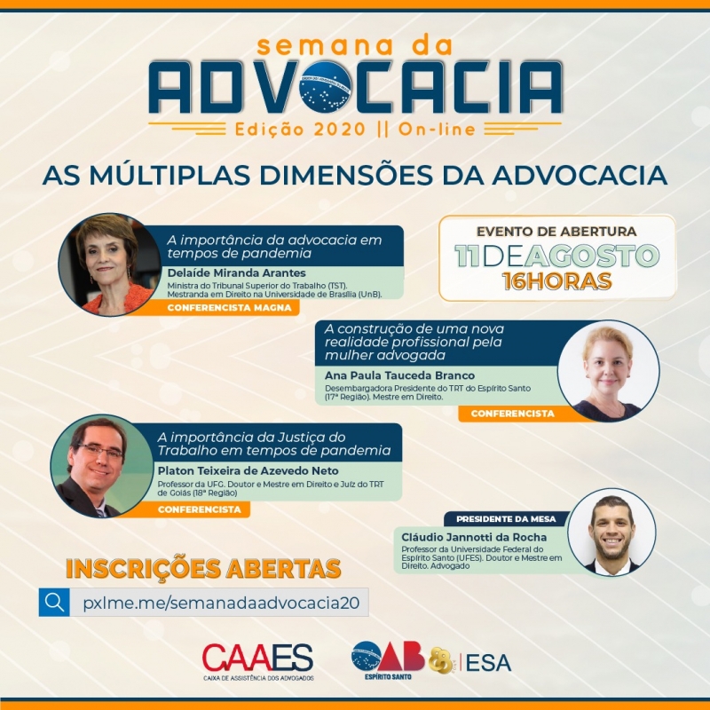 A Semana da Advocacia é o maior evento jurídico do Estado. Neste ano, em especial, o evento traz o tema “As múltiplas dimensões da advocacia” e a programação do evento será toda no formato virtual. O evento é uma realização conjunta da OAB-ES e da ESA-ES.