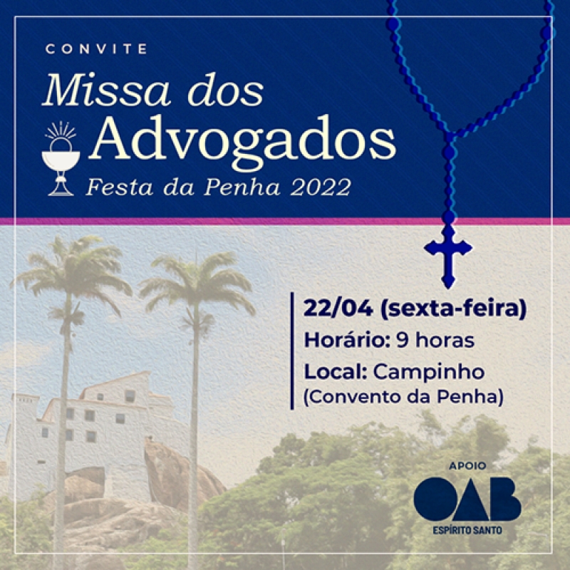 Nesta sexta-feira (22/04), às 9 horas, será realizada, no Campinho, Convento da Penha, a tradicional Missa dos Advogados, durante o Oitavário da Festa de Nossa Senhora da Penha. Além dos advogados e advogadas, estão convidados estudantes, juízes, promotores e toda comunidade jurídica. O tema deste ano é “Saúde dos enfermos, rogai por nós”.