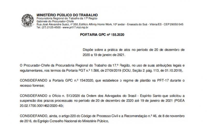 A pedido da Ordem dos Advogados do Brasil – Seccional Espírito Santo, o Ministério Público do do Trabalho 17ª Região suspendeu a contagem dos prazos procedimentais e recomenda a não realização de audiências em que seja imprescindível a presença de advogado (a)s, suspendeu a expedição ou o encaminhamento de informações para publicação, bem como a expedição de notificações ou outros atos de comunicação, com exceção dos atos reputados urgentes, no período compreendido entre 20 de dezembro de 2020 e 19 de janeiro de 2021, nos termos da legislação em vigor.