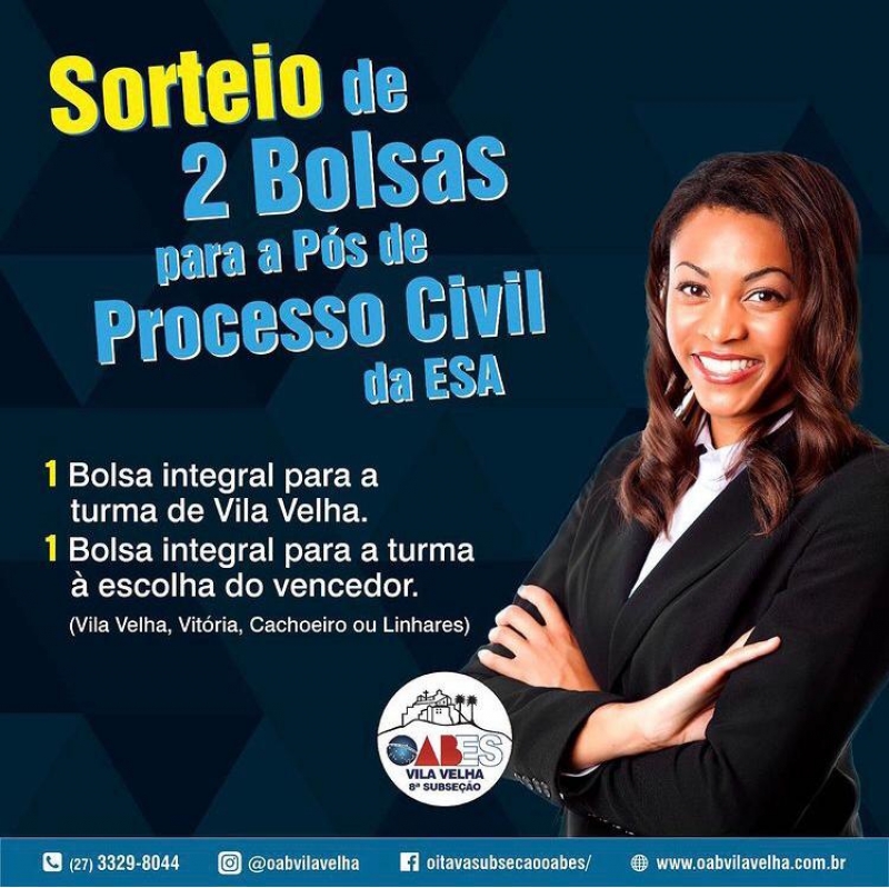 A iniciativa é da Ordem dos Advogados do Brasil - Vila Velha, por meio de seu presidente José Antônio Neffa Junior, que está sorteando duas bolsas integrais (100%) para o curso, coordenado por ele ao lado dos professores Rodrigo Klippel e Tiago Gonçalves.