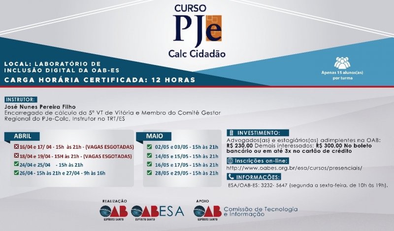 O curso tem carga horária certificada de 12h e as aulas acontecem no laboratório de inclusão digital da OAB-ES . As turmas de 16 e 17 de abril e de 18 e 19 de abril estão com vagas esgotadas, mas as inscrições estão abertas para as seguintes datas: