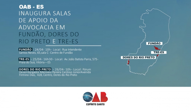 Na terça-feira (24), às 10h, é a vez da solenidade de inauguração da sala de apoio à advocacia no Fórum de Fundão, com a presença da presidente da 14ª Subseção de Ibiraçu, Gracelia Maria Conte. E na quinta-feira (26), a OAB-ES realiza solenidade para inaugurar a sala de apoio à advocacia em Dores do Rio Preto com a participação do presidente da 6ª Subseção de Guaçuí, Luiz Bernard Sardenberg.